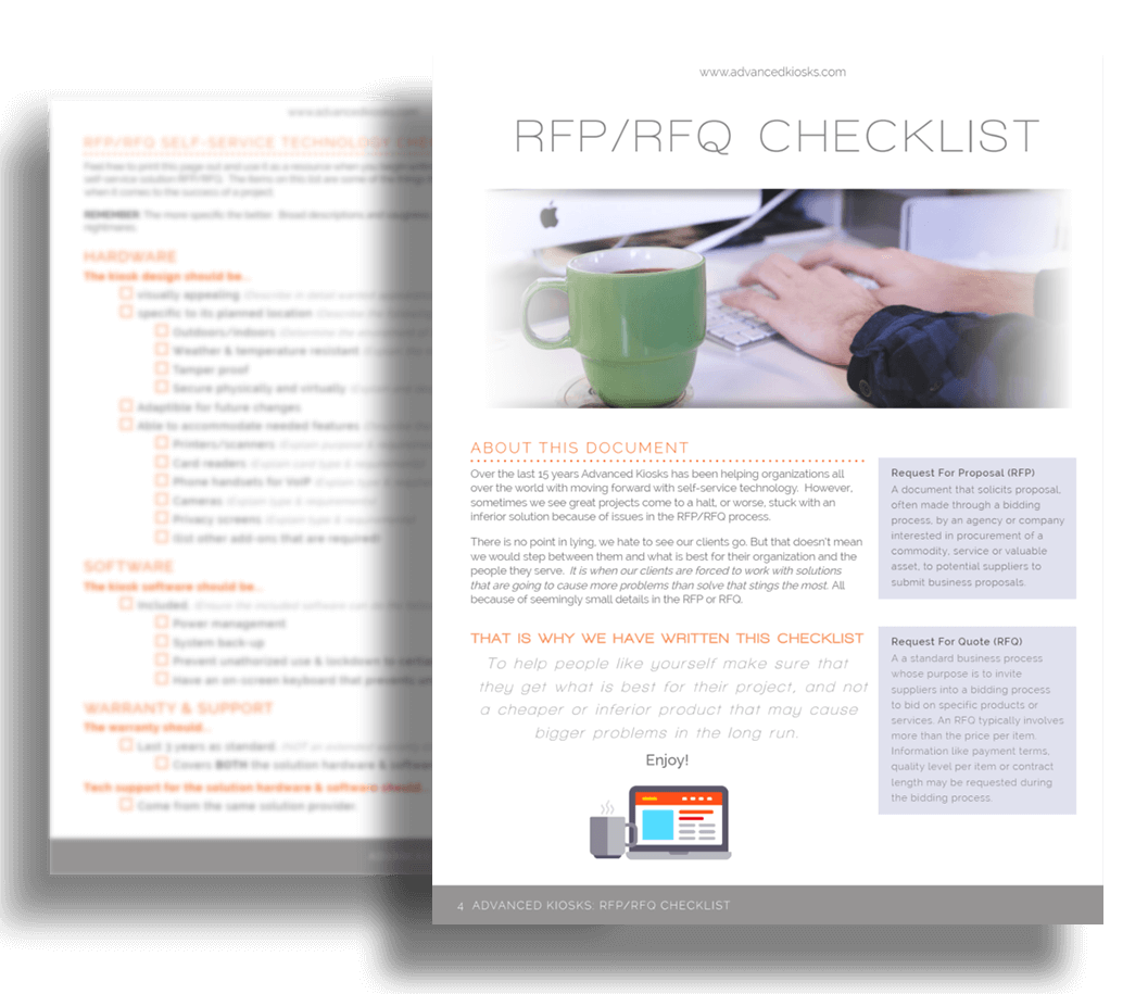 This checklist helps you avoid costly mistakes during the bidding process by ensuring you ask the right questions and set the right requirements. Use it as a guide to secure the best kiosk solution for your organization.