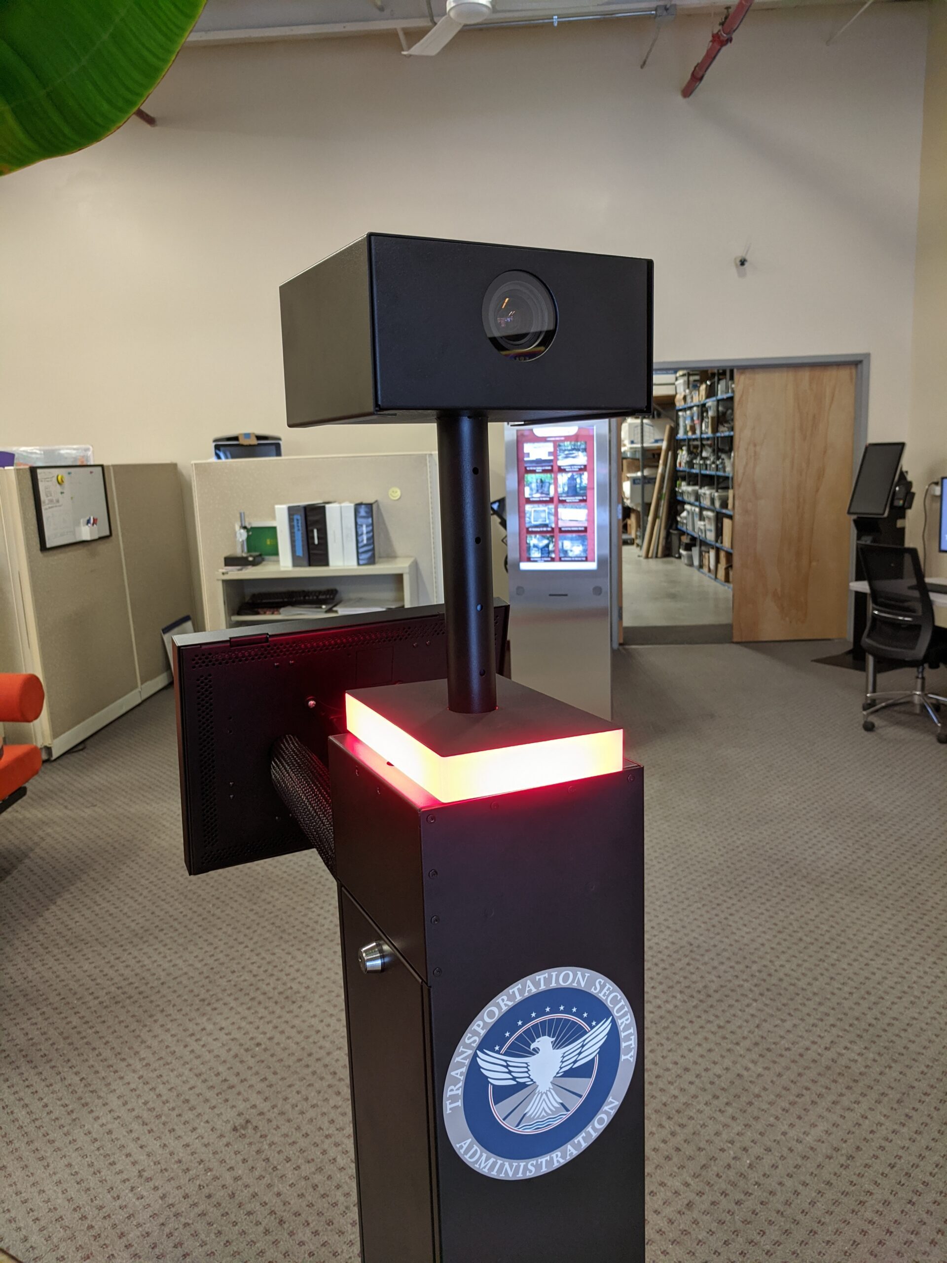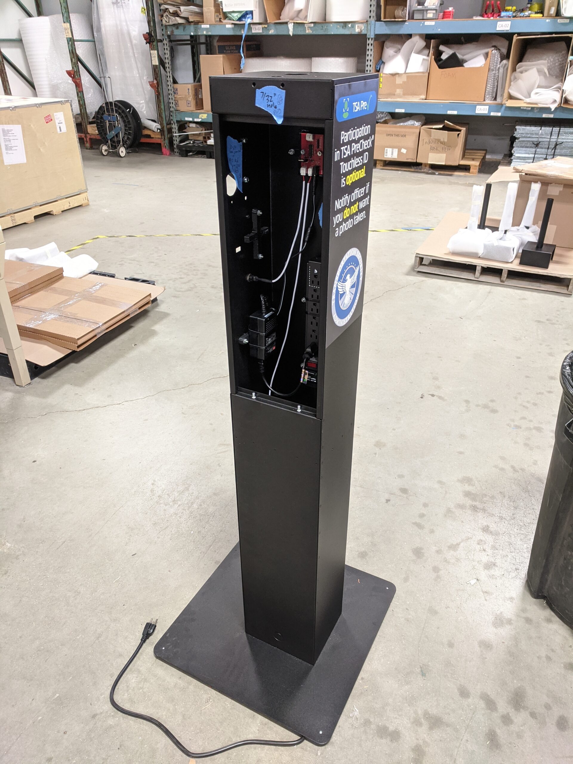 11. Move the kiosk into the position where it will be used. Plug the power into a standard outlet. The lightbar should illuminate either red or blue. There is a small switch below the PIV card reader on the kiosk that will change the color from one to the other color. When the light is blue, there is also a small fan below the protective grill on the kiosk body that should begin pulling air. Ensure that the fan is spinning when the light is blue and that the fan is off when the light is red.