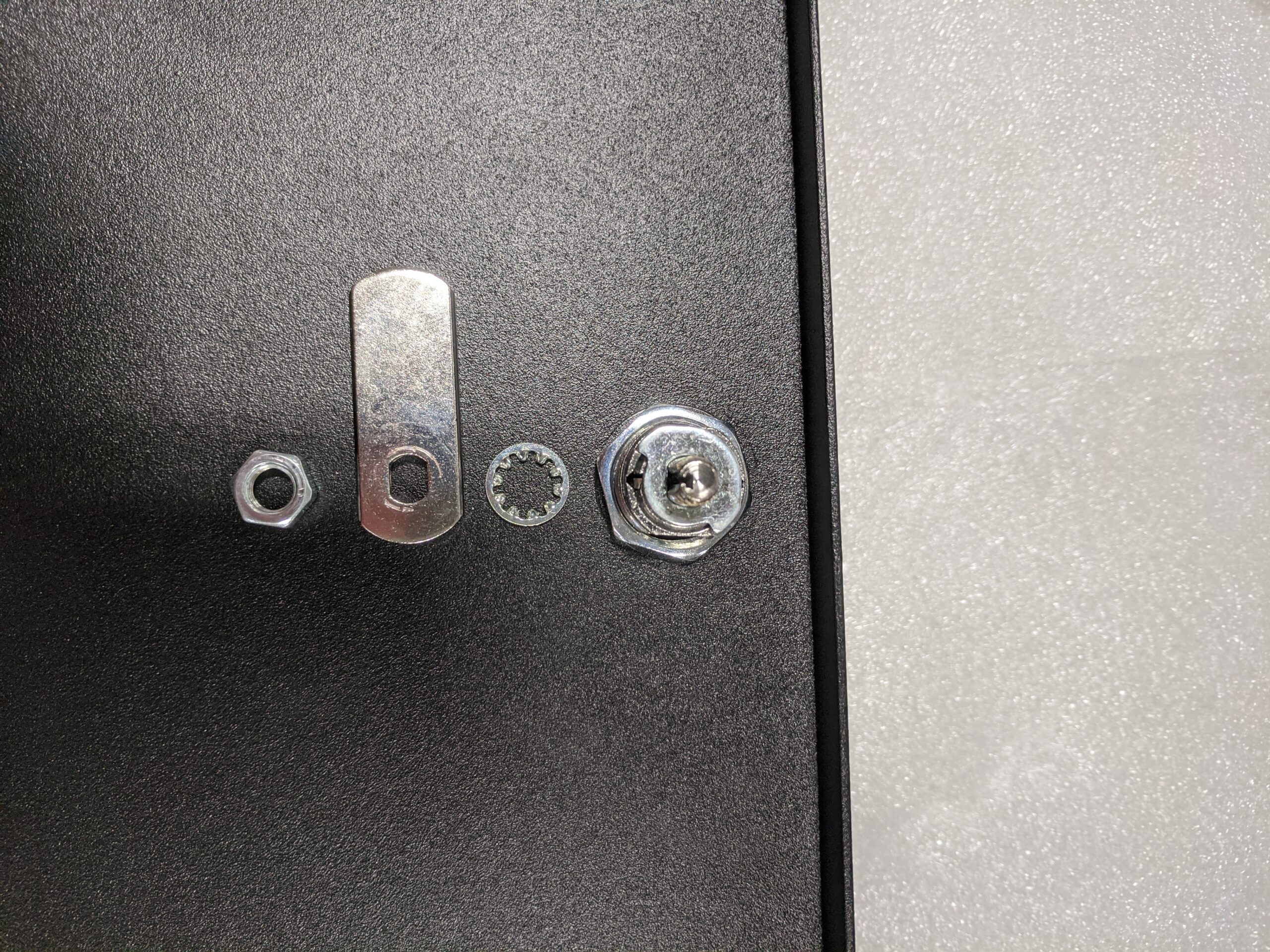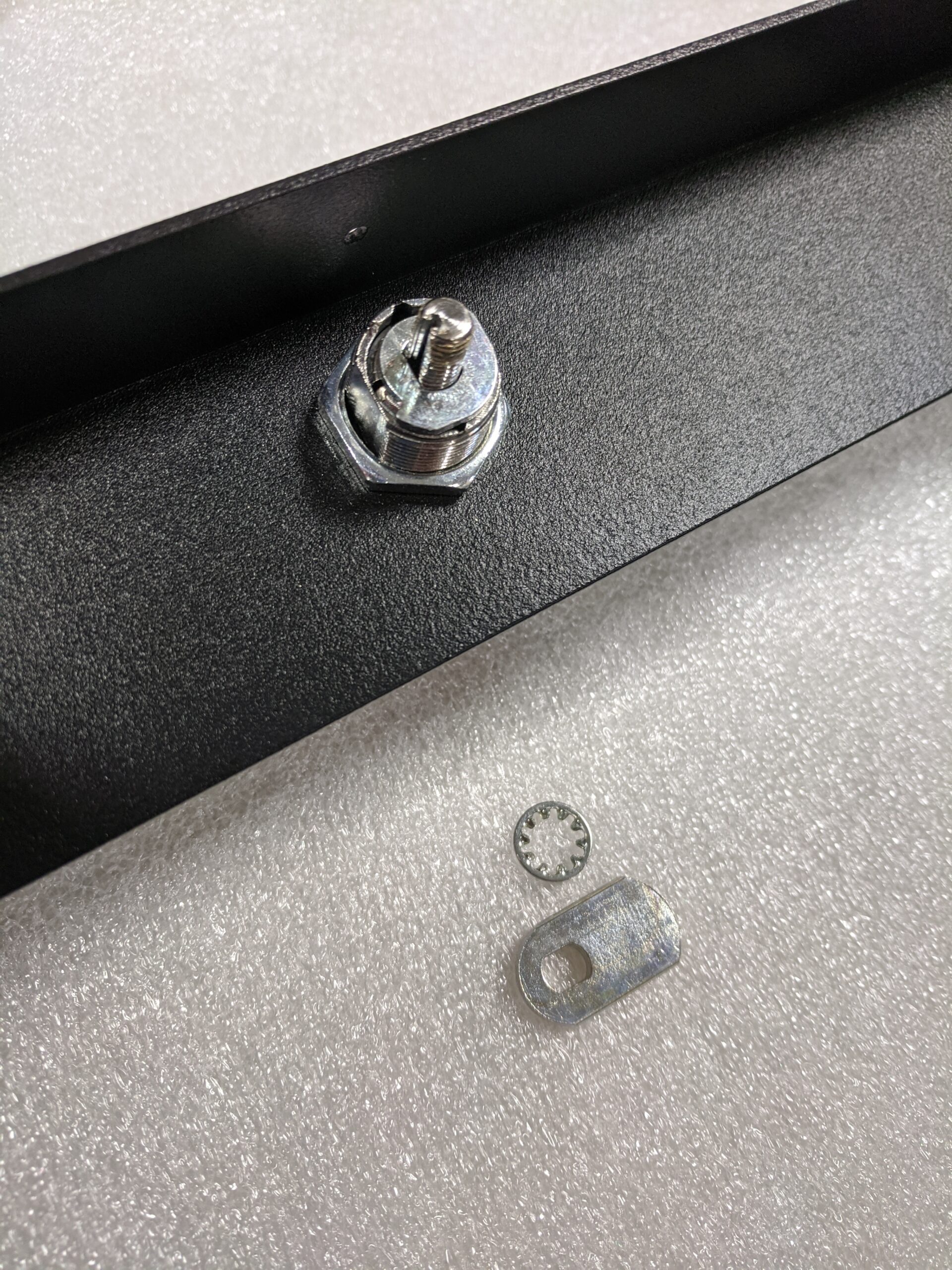 9. Remove the blue tape from the main access door from the kiosk. You will need to install a lock and cam into the door. The picture below will show the correct orientation. Set the door aside and install the USB hub on the long electrical mounts inside of the kiosk. There is a small piece of double-sided sticky tape to aid in the process. There will be zip ties preinstalled into the mounts to make this process as easy as possible. Plug the USB peripherals into the hub (PIV reader, camera, tablet, CAT6 cable if desired) and run the connector USB cable and power cable up to the tablet. You can make a small incision in the corrugated plastic tube or run the cables up through the braided sleeve. If you run the cables through a hole in the corrugated tube, use electrical tape to cover the hole to preserve good airflow from the fan. Use the extra zip ties and zip tie mounts to secure any loose cables.