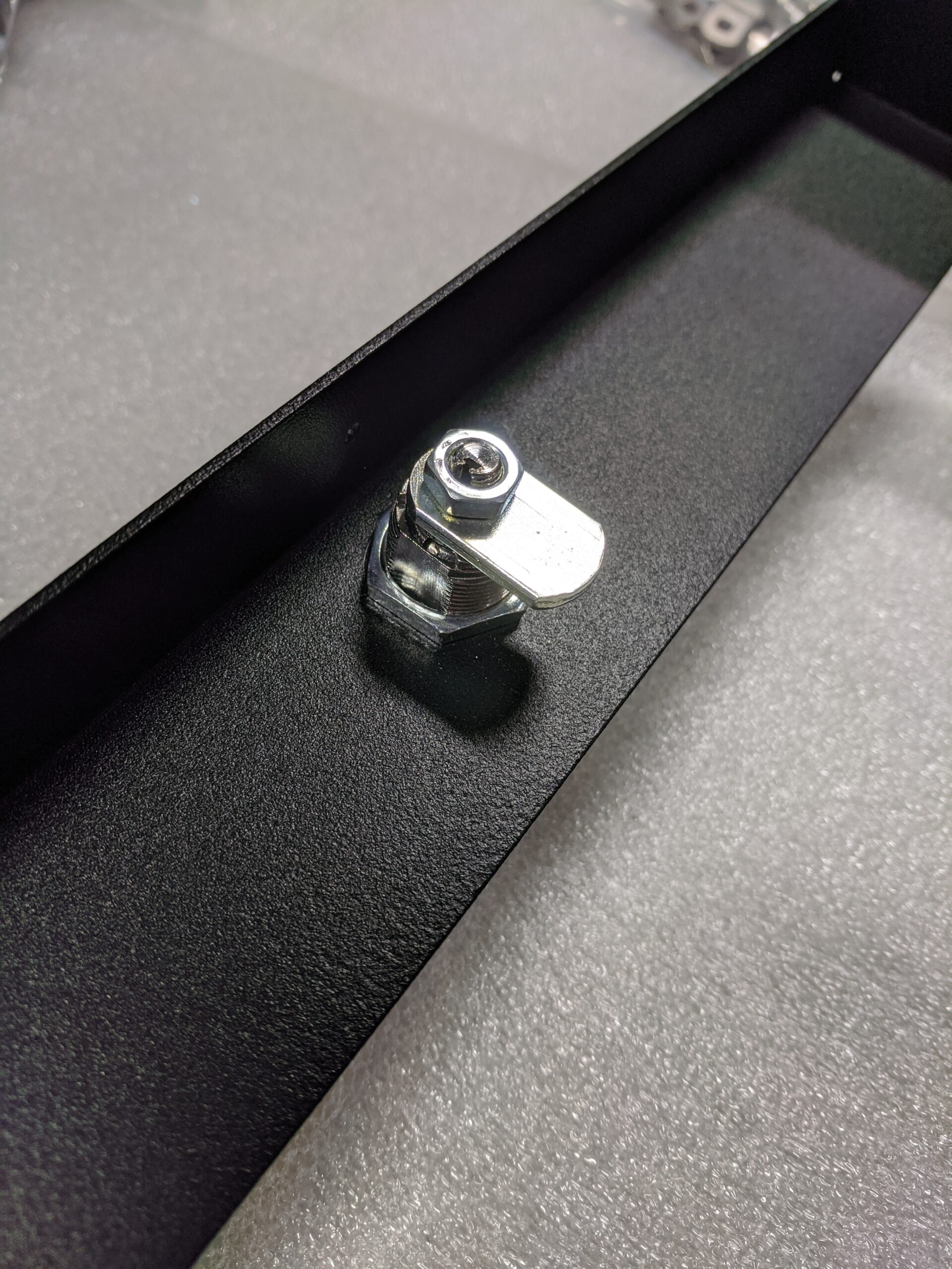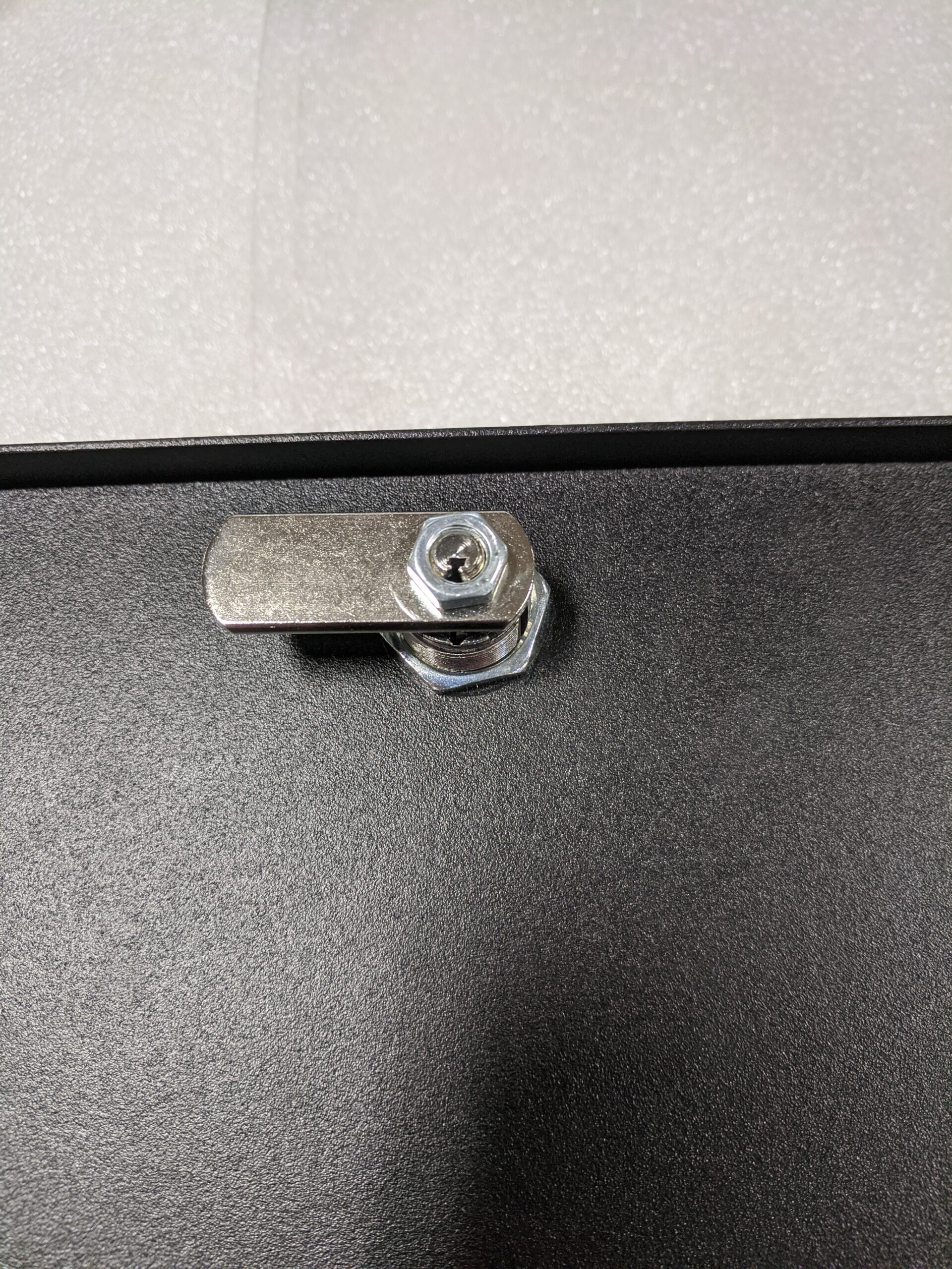 10. Install the privacy screen onto the tablet. Remove the cover from the tablet holder and remove all packing materials. There are small pieces of foam that help hold the tablet in place once in the holders. Plug the tablet into the USB cable and snap into place. The top and bottom 3D printed mounts are made of a carbon fiber reinforced material and should flex just enough to get the tablet into place. Install a lock and cam into the face of the tablet holder as shown below and reinstall the tablet holder door.