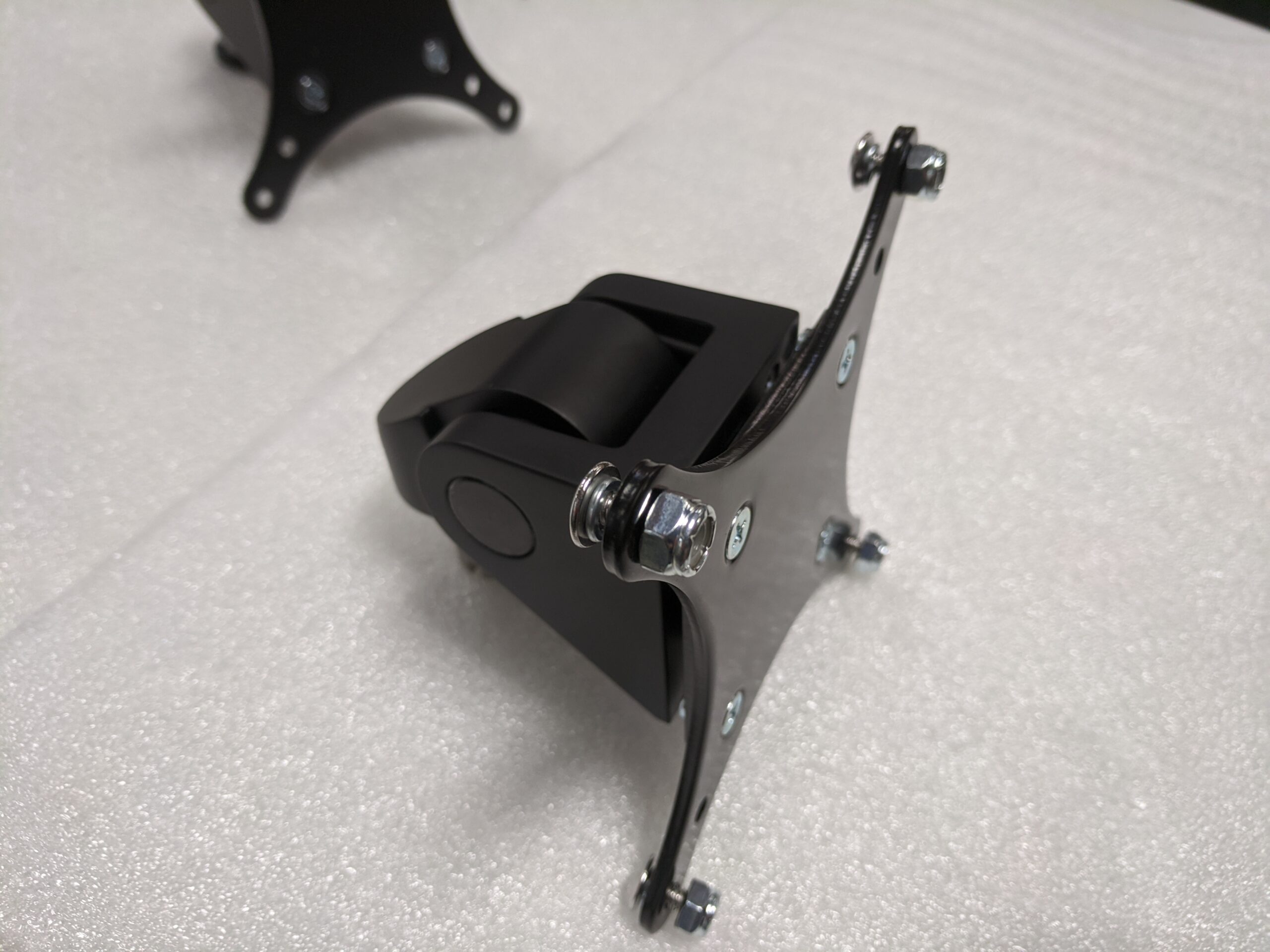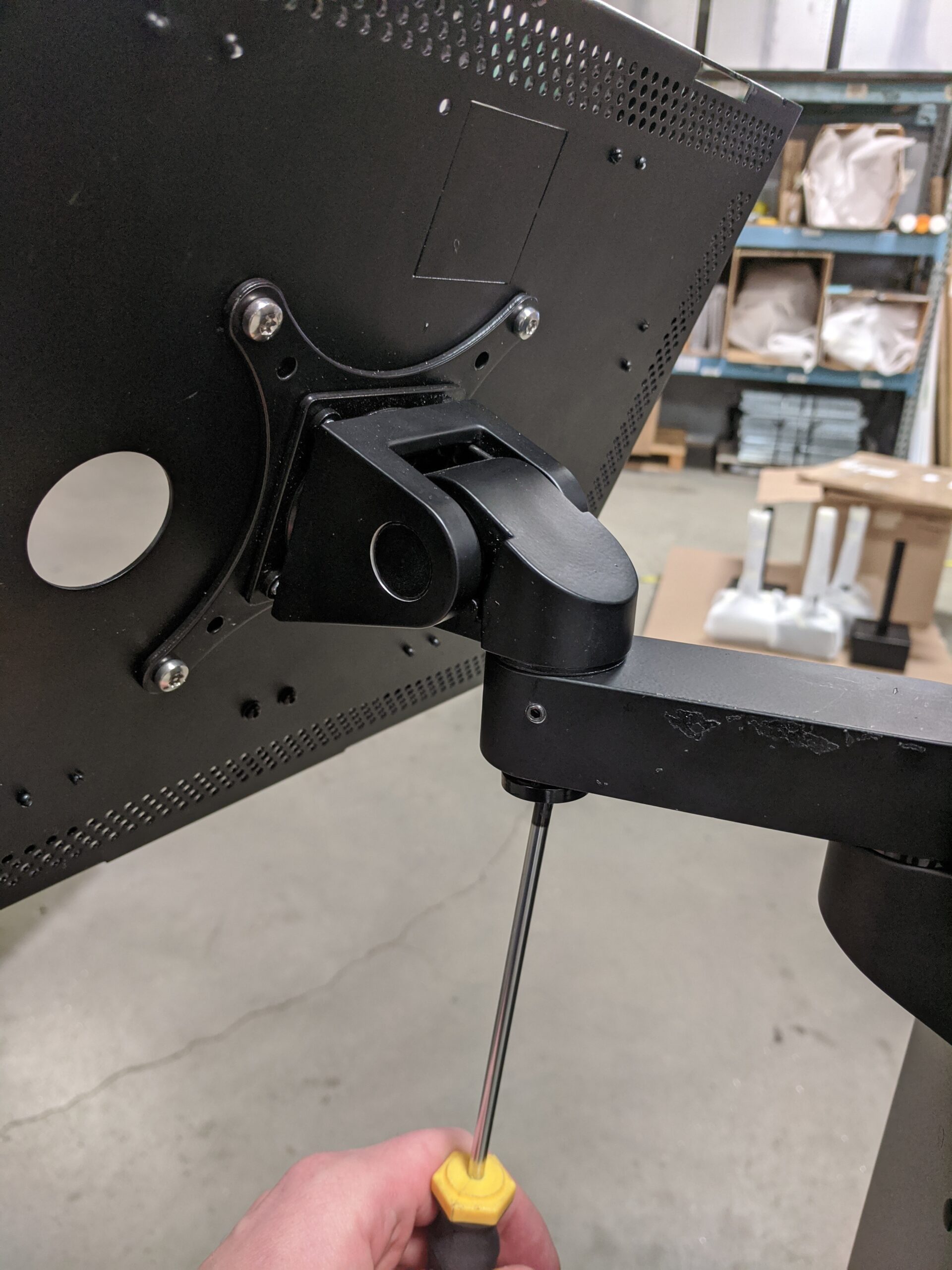 5. Mount the tablet holder mounting plate to the tablet holder. The screws, washers and nuts should be preinstalled in the correct orientation. Install the tablet holder using this hardware. Then remove the small Philips head bolt holding the plate that connects the tablet holder to the extension arm. Install the tablet holder and then re-install the tablet holder plate noting the two notches that sit in the receiver side of the plate surface. Tighten the screw until the tablet holder will move with firm action.
