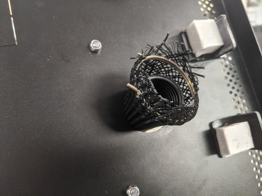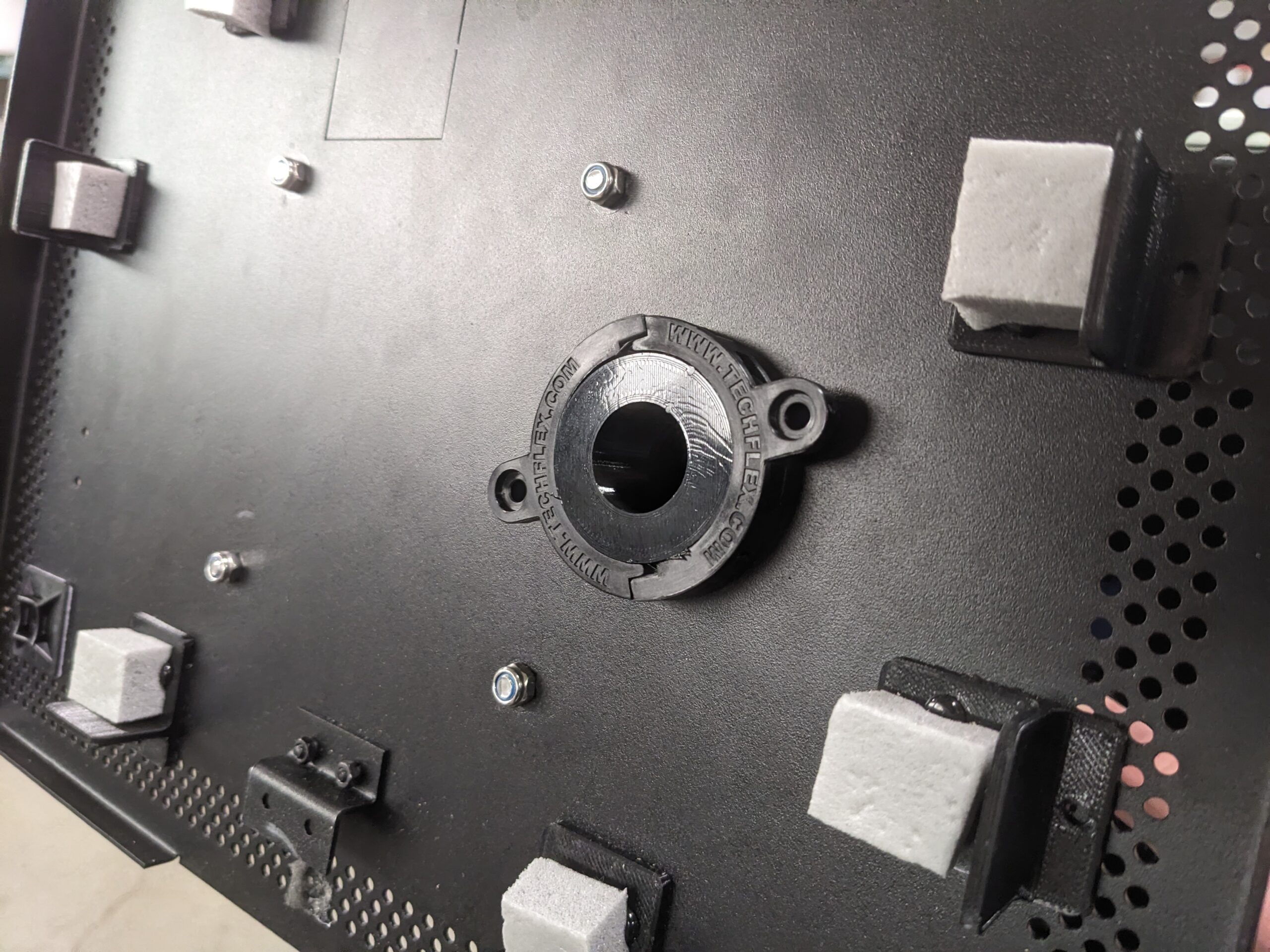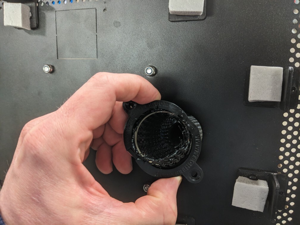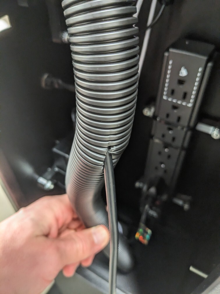 6. Feed the corrugated tube with the braided sleeve that protrudes from the kiosk through the hole in the back of the tablet holder. You will use the 2-part black collar with wire insert and the 3D printed corrugated sleeve insert for this step. Once the tubes are through the hole, insert the metal ring .5 to 1” into the braided sleeve. Line up one of the parts of the black plastic so that the two prongs are held in place by the black plastic piece. Then snap the other black plastic piece into the first one so that it wraps around the corrugated plastic tube and won’t go back through the hole in the tablet holder. Then put the 3d printed plug into the corrugated tube so that both pieces are held in place. At this point, you can make a small incision in the corrugated plastic tube to insert the USBC cable through that connects the hub to the tablet. Use a small piece of electrical tape to cover the hole once the cable is in place.