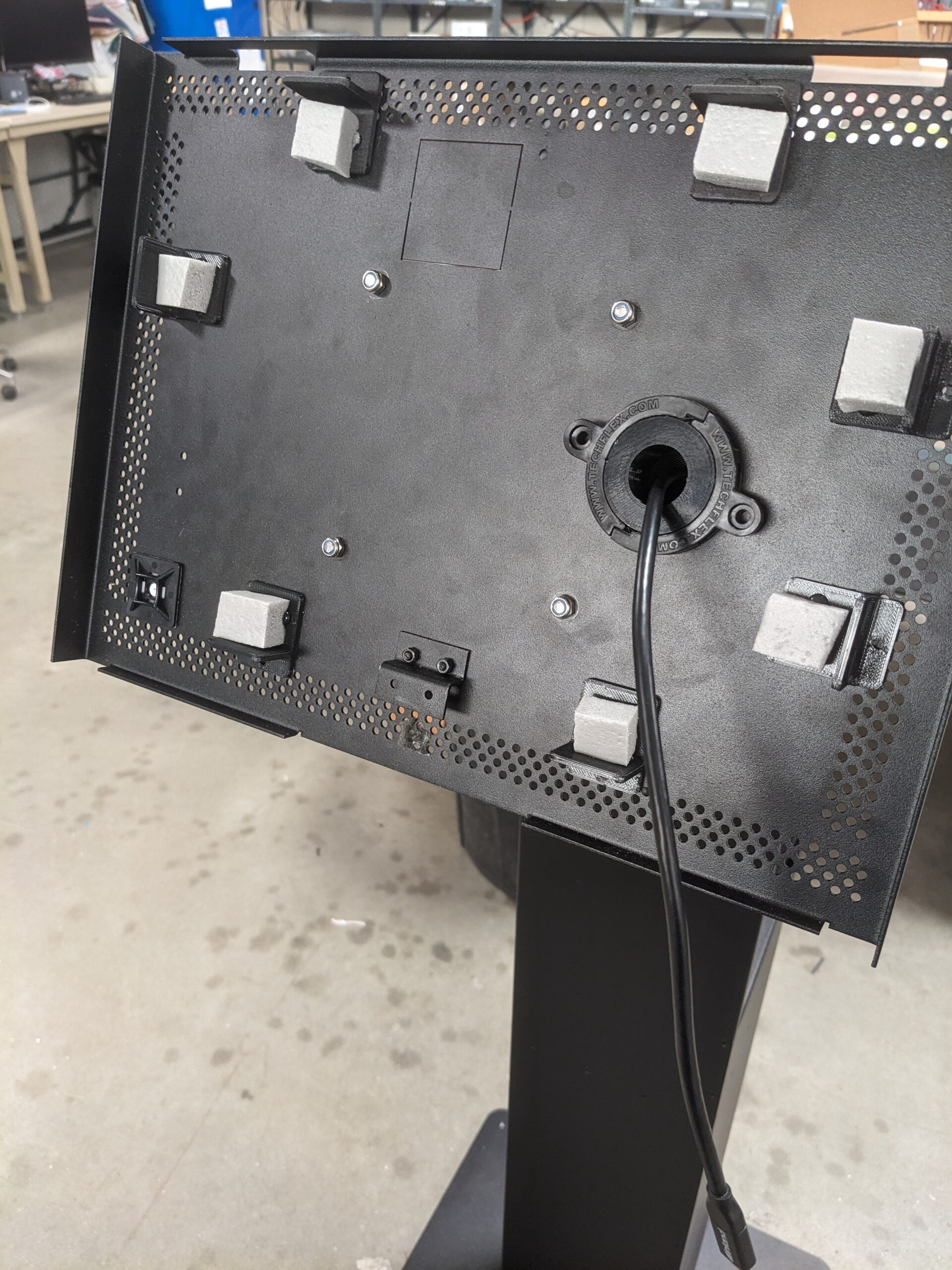 - Inside main kiosk body: wheels and tablet holder mounting plate