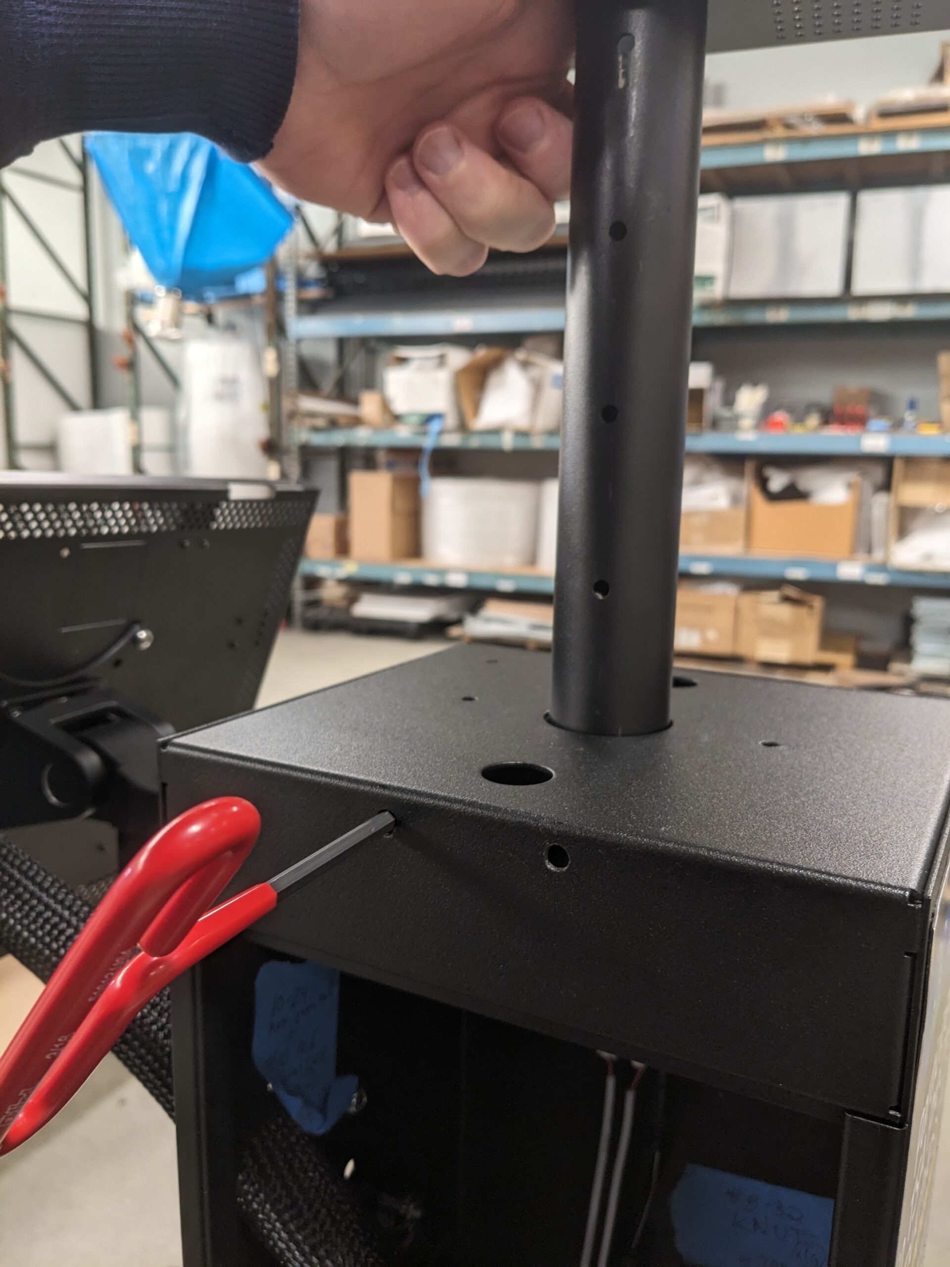 3. If you don’t have a small table, use the cardboard box that the kiosk arrived in to lay the main body parallel to the ground. At the bottom of the kiosk body, you will find qty 4 of 10-32×3/4” Allen head bolts preinstalled. Use a 5/32” Allen key to unscrew the 4 bolts. Note the sticker on the bottom of the main kiosk body noting the orientation of the base once installed. Line the base up with the sliding feet facing towards you and thread the bolts back into the kiosk body.
