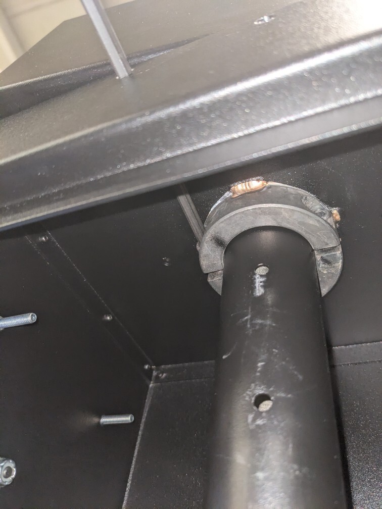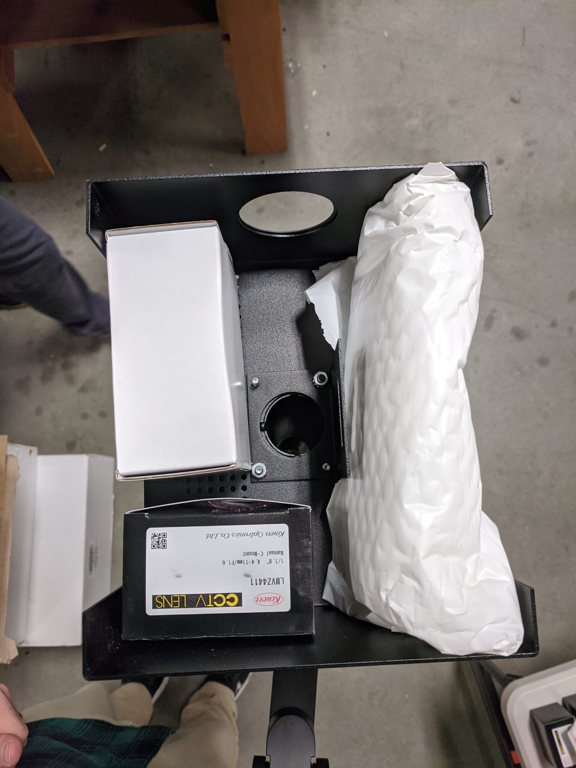 8. Place the camera top hat upside down on a padded surface so that you can remove the 4 screws that hold the cover on. Use a 1/8” Allen head wrench to remove the 8-32×3/8” bolts from the bottom of the hat assembly and set aside. This will allow you to slide the cover off of the top hat, revealing the camera, lens, glass cover with plastic lens gasket, and USB cable zip tied to the mounting bracket. Assemble the camera according to ASRC specs and install on the internal bracket finger tight. Reinstall the mast into the kiosk and make all necessary adjustments before reinstalling the camera lid onto the top hat. Re-install the camera mast into the hole in the top of the kiosk to the proper height and angle and then tighten down the internal collar. Install the hole plugs from the bag of essential items only once you are satisfied with the height and angle.