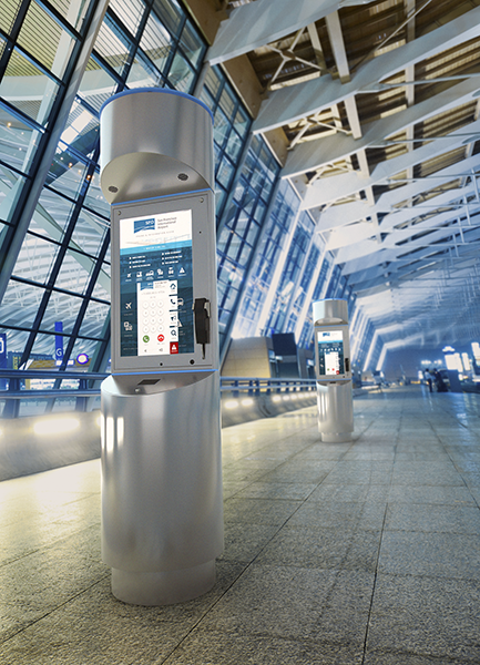 Standing at over seven feet tall, the Tower Kiosk is a touch screen, airport computer kiosk wrapped in a rugged stainless steel enclosure. Impenetrable and sleek; secure and convenient, this airport kiosk is made to last and looks good doing it. This computer kiosk can help airports automate wayfinding, information, security warnings, international phone services, and lost and found management.